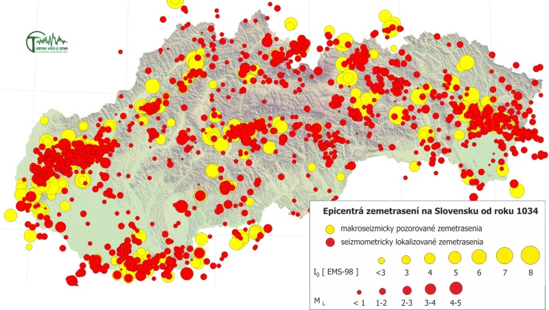 Epicentrá dokumentovaných zemetrasení na Slovensku (1034 - súčasnosť)