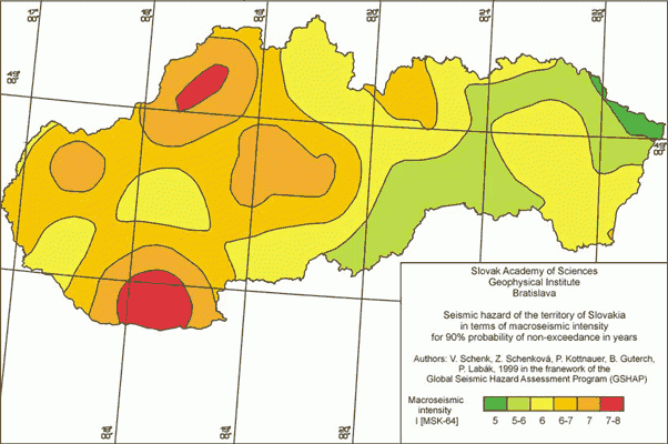 Mapa seizmického ohrozenia územia Slovenska v hodnotách makroseizmickej intenzity pre 475-ročnú návratovú periódu